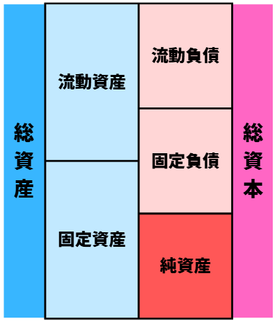 ROEとの違いは、「(ROE)株主資本」か「(ROA)総資産」かの違いですね。つまり株主資本には負債が入っていませんが、総資産には負債が入っています。下の図(貸借対照表)を見てもらえれば、イメージしやすいかと思います。