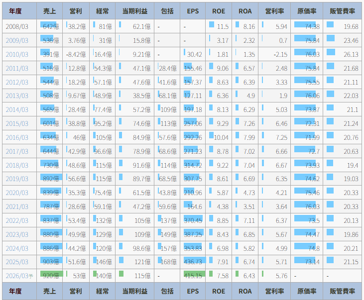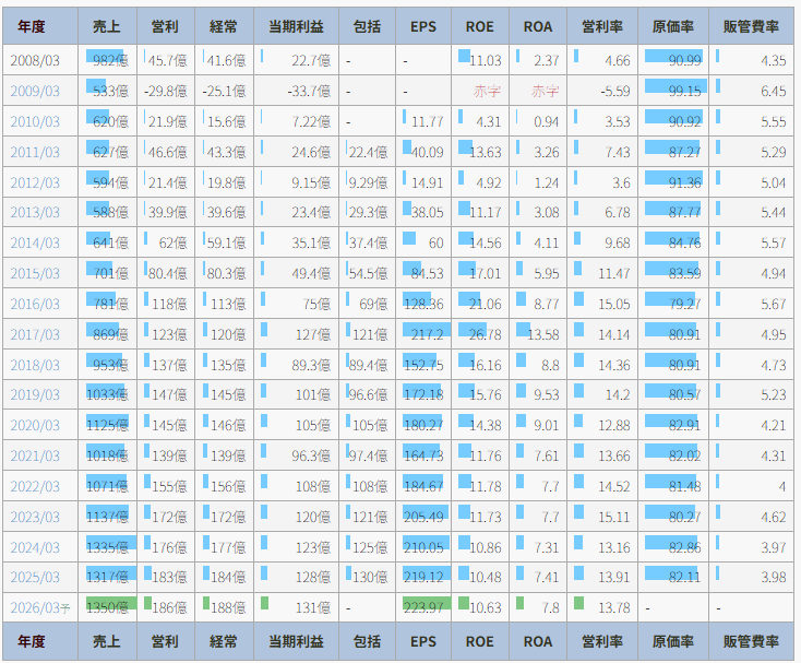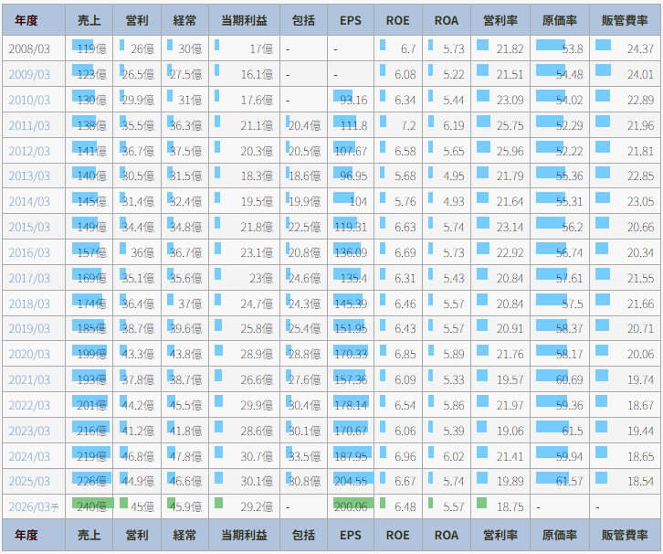 売上は緩やかな右肩上がり。営業利益・当期純利益もかなり堅実で安定感があります。