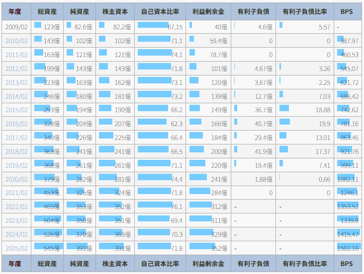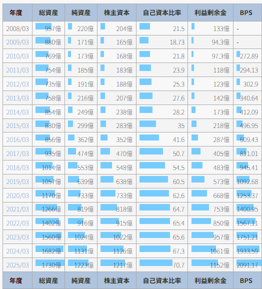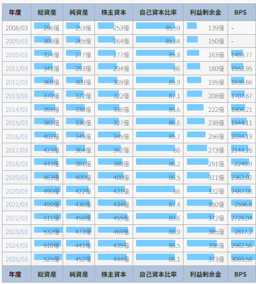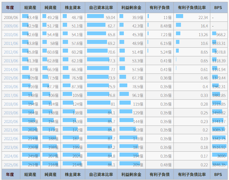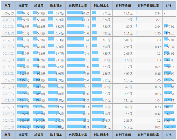 自己資本比率は安定して高く、純資産も順調です。有利子負債比率が0なのも安心ですね。