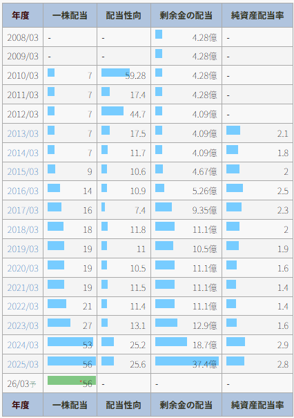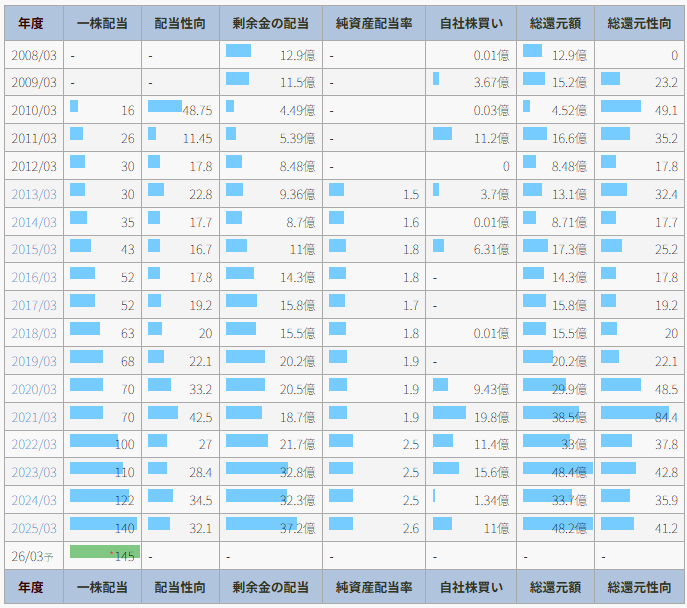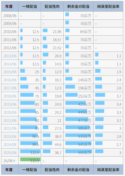 一株配当は2010年以降一度も減配はありません。配当性向も25%と低く、増配の余地もまだあるでしょう。