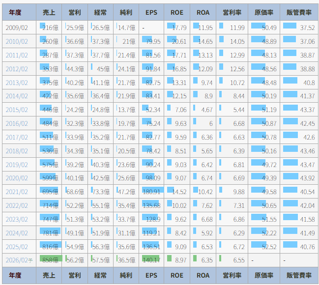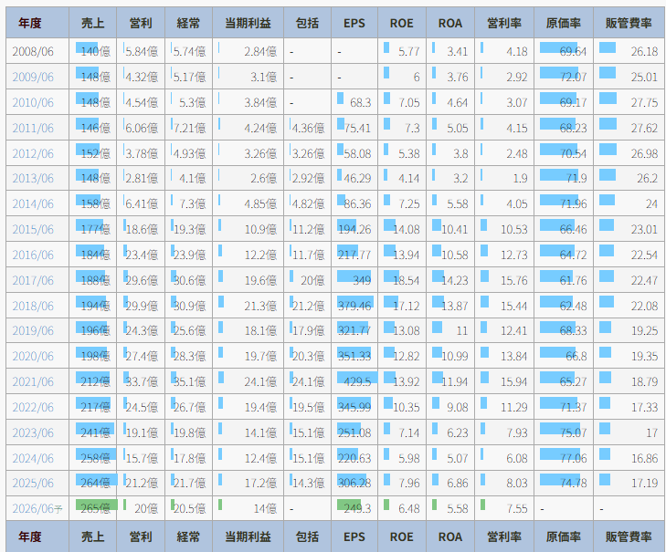 売上は順調に右肩上がりです。営業利益、純利益も安定していますね。ROAはSBIスクリーナーでは10.5%でしたが、こちらでは6%台ですね。