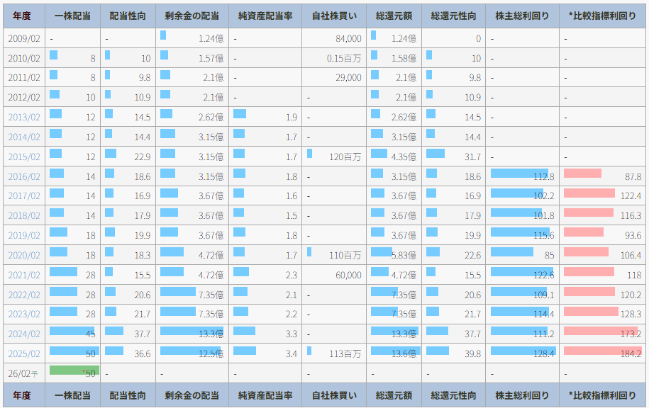 本銘柄は比較的ニッチで専門性のある製品を扱っているため、景気の影響も受けにくいです。一株配当も伸びてますし、安定感があって長持ちできそうな銘柄ですね。
