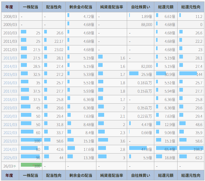 一株配当は、2024年3月に減配しているように見えますが、2023年3月は特別配当が出ており、通常70円+30円の特別配当なので、減配ではないですね。ということで、こちらも15期以上非減配が続いています。