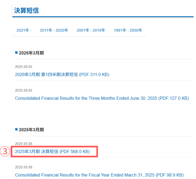 続いて、下記の③の、2025年3月期の決算短信をクリックしましょう。ちなみに最新は2026年3月期第1四半期の決算短信ですが、まずは決算時期(2025年3月)の決算短信を見てみます。