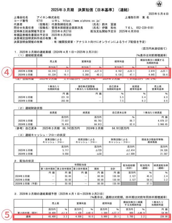 ④に直近(2024年度)および前年(2023年度)の経営成績が記載されており、一番下の⑤で来期の業績予想が記載されています。まずはこれらの数字を眺めてみましょう。