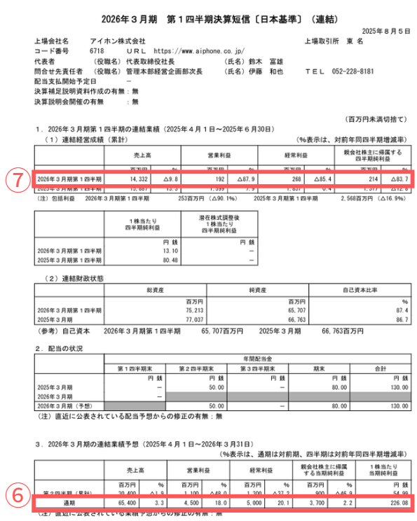 決算時の決算短信と比べるとちょっと内容が異なりますが、見るところは同じで、⑥の業績予想を見てください。本発表では、決算時から変更はないようですね。