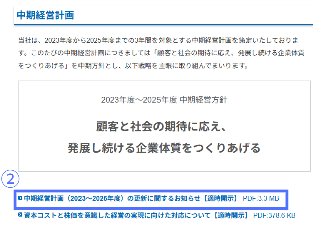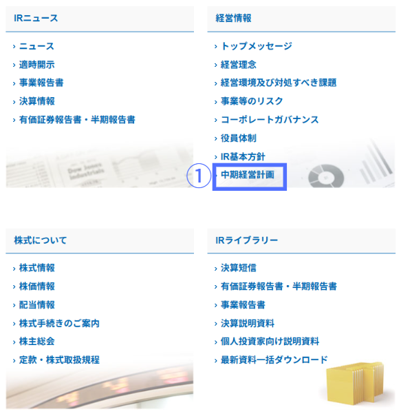 アイホンだと、下記の場所にありました。株主・投資家情報⇒経営情報の①中期経営計画⇒②です。