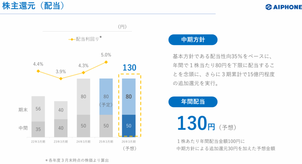 ・第8次中期経営計画(2023~2025年度)の配当金は下限80円だが、追加還元分を合わせて今期予想130円