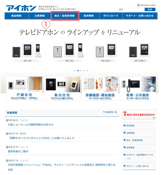 ホームページまで飛んだら、①の「株主・投資家情報」というボタンがトップページ上部にあります。そこをクリックしましょう。