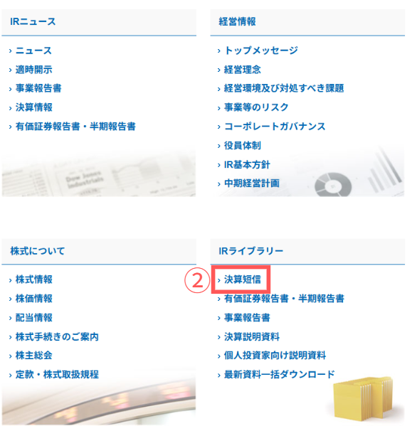 ①をクリックしたら、少し下に行き、IRライブラリーの②「決算短信」をクリックしてください。